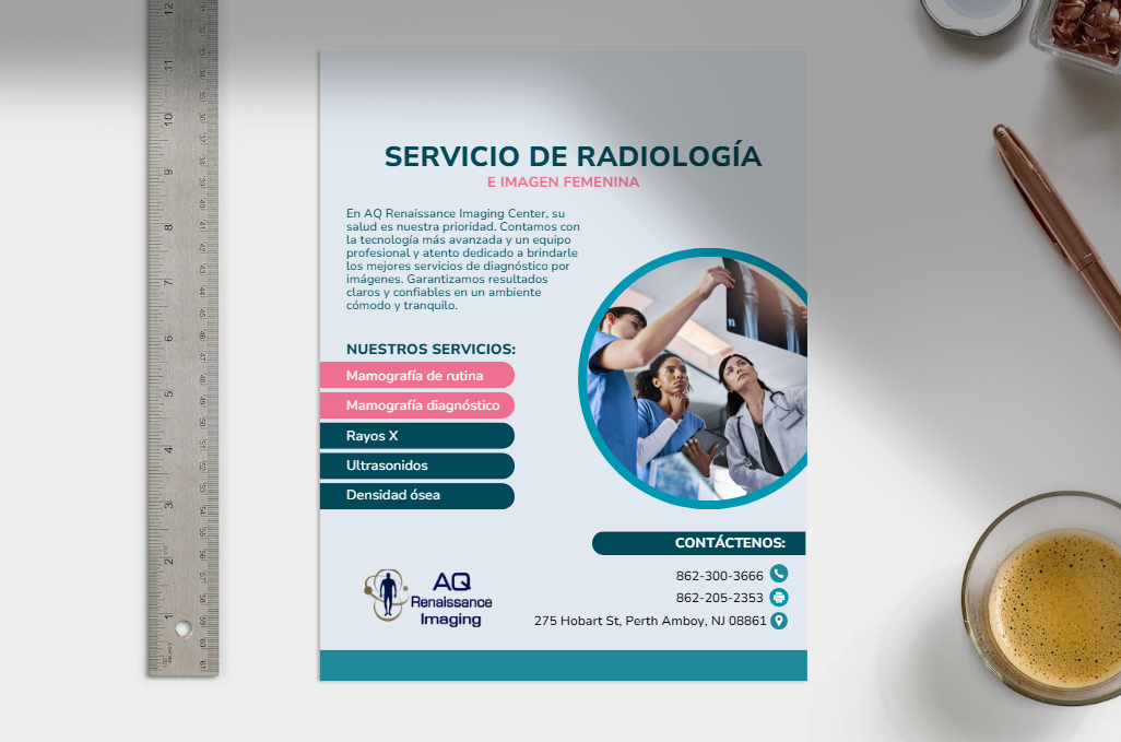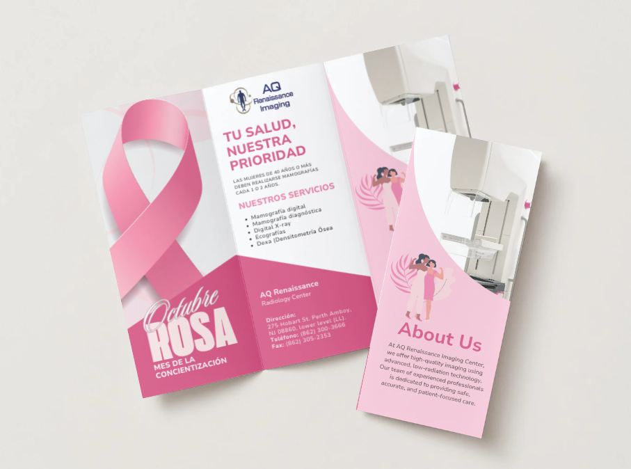 As Office Manager, I took the initiative to address this issue by designing a series of bilingual marketing materials that captured the professional and empathetic essence of our office. Through informational flyers, a banner, and a brochure for Breast Cancer Awareness Month, I created a visually appealing and easy-to-understand solution that would guide patients to our services.